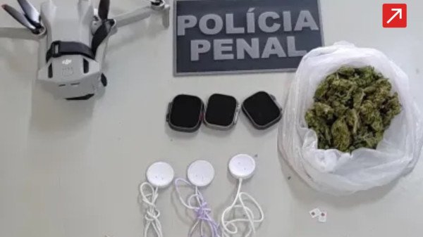 Policiais penais encontraram o equipamento no pátio da Triagem. A Secretaria de Administração Penitenciária e Ressocialização (Seap) detalhou que havia um pacote com 36 gramas de substância semelhante à maconha, três smartwatches, três carregadores e dois chips de celular presos à estrutura do drone.