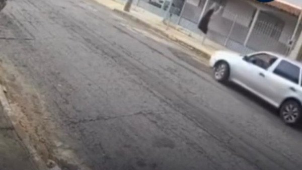 Câmeras de segurança registraram o momento de desespero em que a mulher corre e escala a grade do imóvel para se proteger. Apesar da rápida reação, ela foi atingida parcialmente, resultando em ferimentos leves.