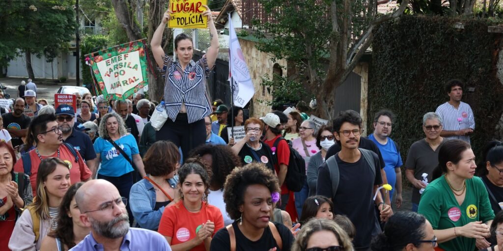Percorrendo ruas em uma caminhada que partiu da unidade escolar, o grupo ergueu cartazes pedindo o fim da violência no ambiente escolar e fez coro a mensagens como “Onde houver intolerância, que haja mais educação”, “Mais amor e mais livros, menos violência” e “Escola não é lugar de polícia”.