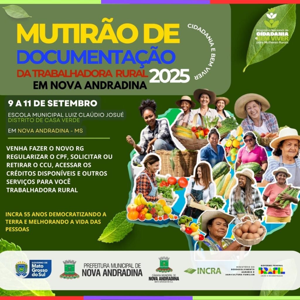 Começa nesta terça-feira (9) o “Mutirão de Documentação da Trabalhadora Rural” em Nova Andradina, uma ação voltada à inclusão social e à cidadania, que facilitará o acesso a diversos documentos essenciais. A iniciativa terá foco em famílias assentadas e quilombolas, mas estará aberta a toda a população que desejar participar.