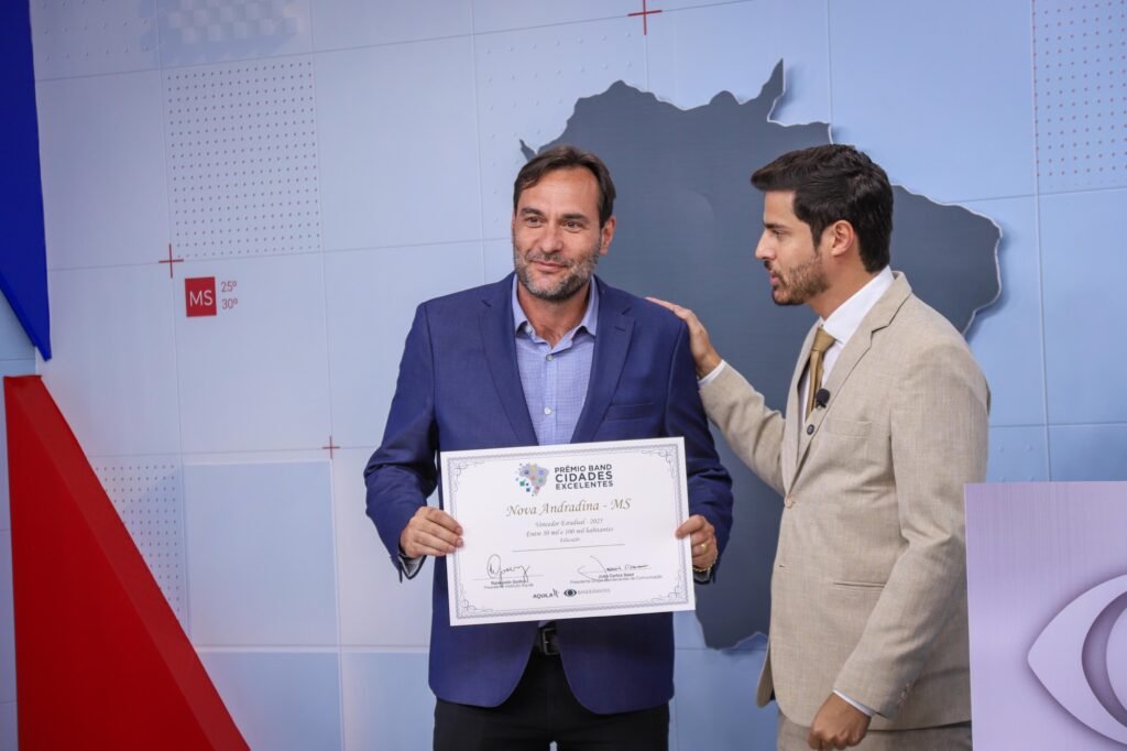 Nova Andradina alcançou mais um marco importante na gestão municipal ao receber três reconhecimentos no Prêmio Band Cidades Excelentes. Durante a edição ao vivo do programa Bora MS, exibido nesta terça-feira (2) pela TV Guanandi, afiliada da Band em Campo Grande, o município foi premiado em três categorias, posicionando-se entre as cidades com melhores indicadores administrativos, educacionais e de governança em Mato Grosso do Sul. O prefeito Dr. Leandro Fedossi esteve no estúdio para receber as certificações e celebrar mais uma conquista que reforça o avanço da gestão pública.