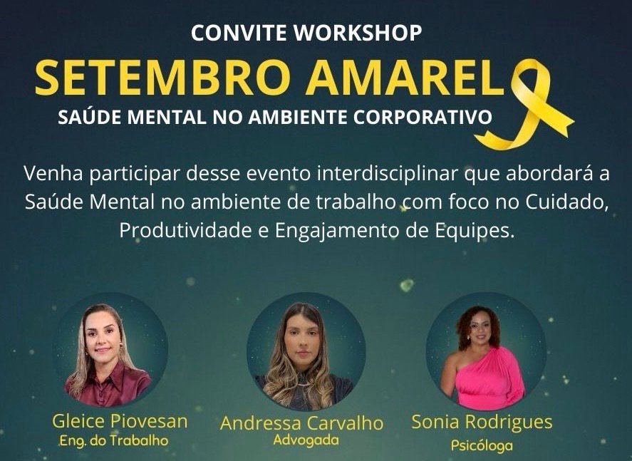 O Setembro Amarelo é uma campanha de conscientização sobre a importância da prevenção ao suicídio e da saúde mental. Para reforçar a relevância do tema no ambiente de trabalho, estamos organizando o evento: “Saúde Mental Corporativa: Cuidado, Produtividade e Engajamento da Equipe”, que acontecerá no dia 30 de setembro de 2025, na OAB, a partir das 19h.